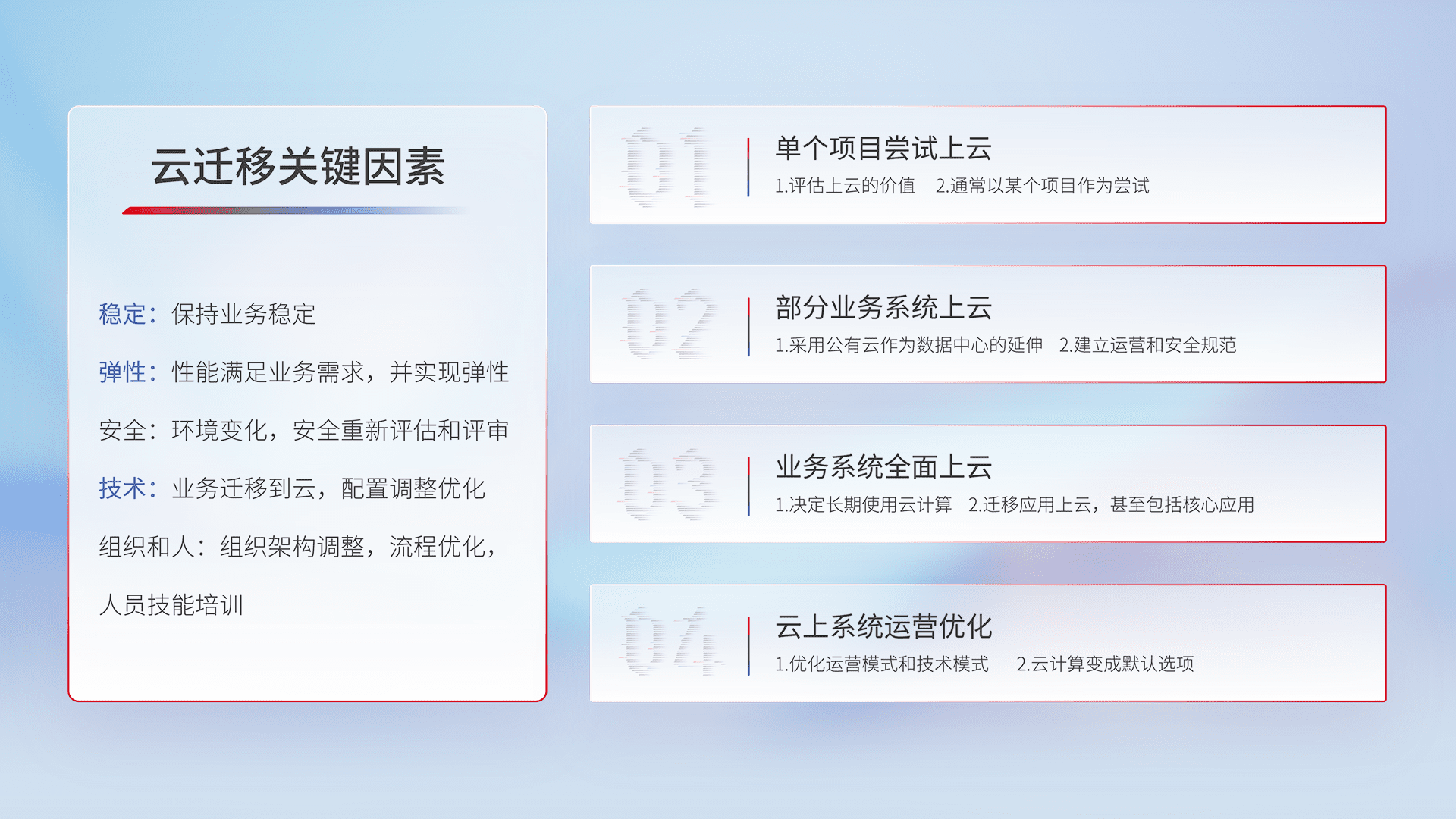 结合实际业务,,,,从规划设计、、、、云平台选型、、云原生改造、、数据迁移、、、集成交付,,,,迁移全过程为客户识别最佳上云路径,,,,做好风险识别管理,,,,设计网络架构、、身份权限、、、、安全审计合规、、、操作审计、、、日志审计、、、监控告警策略、、、多站点容灾设计等,,对云上基础设施进行整体规划,,,提升IT治理水平,,以满足弹性、、高可用、、高性能的需求。。。