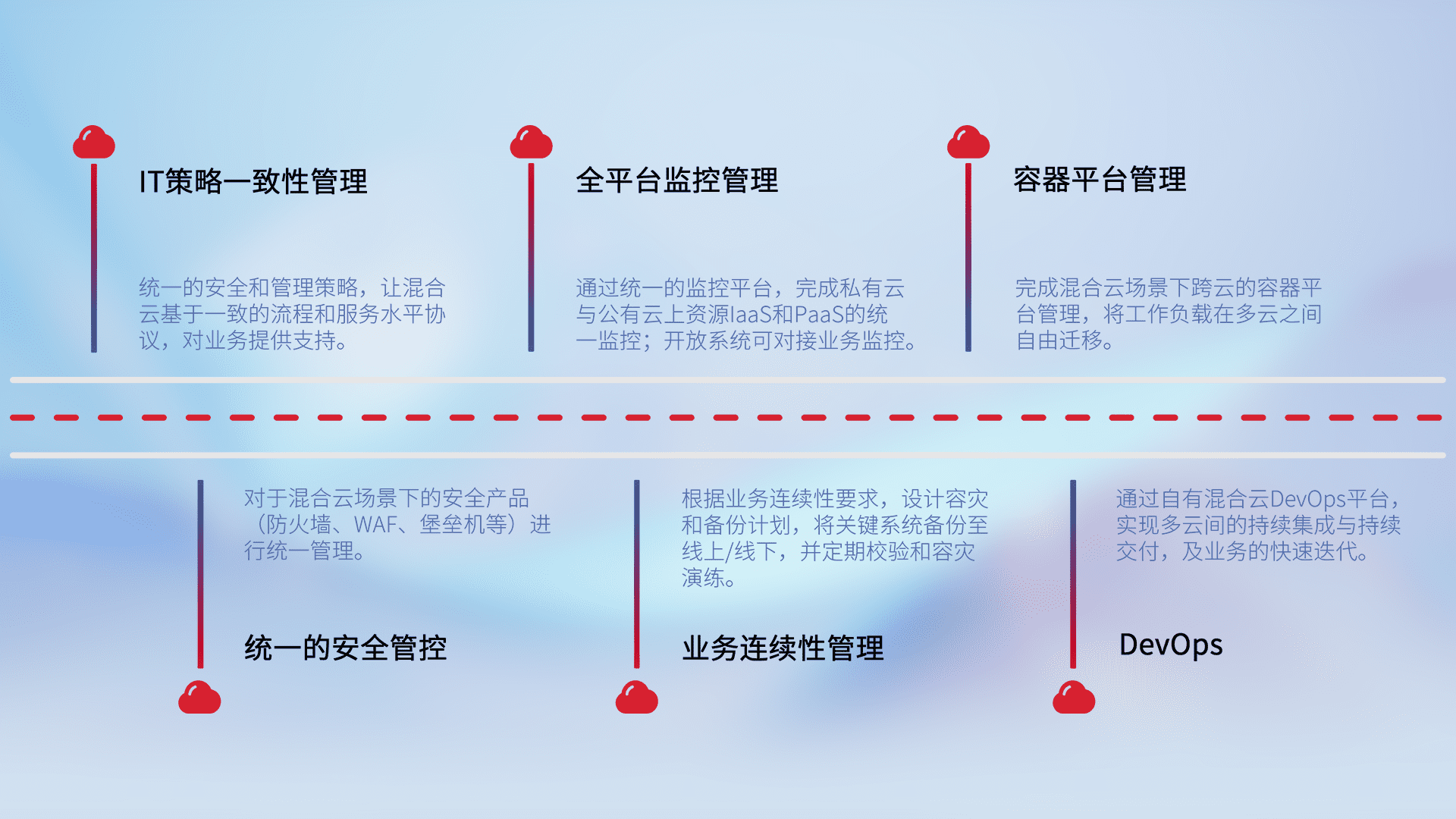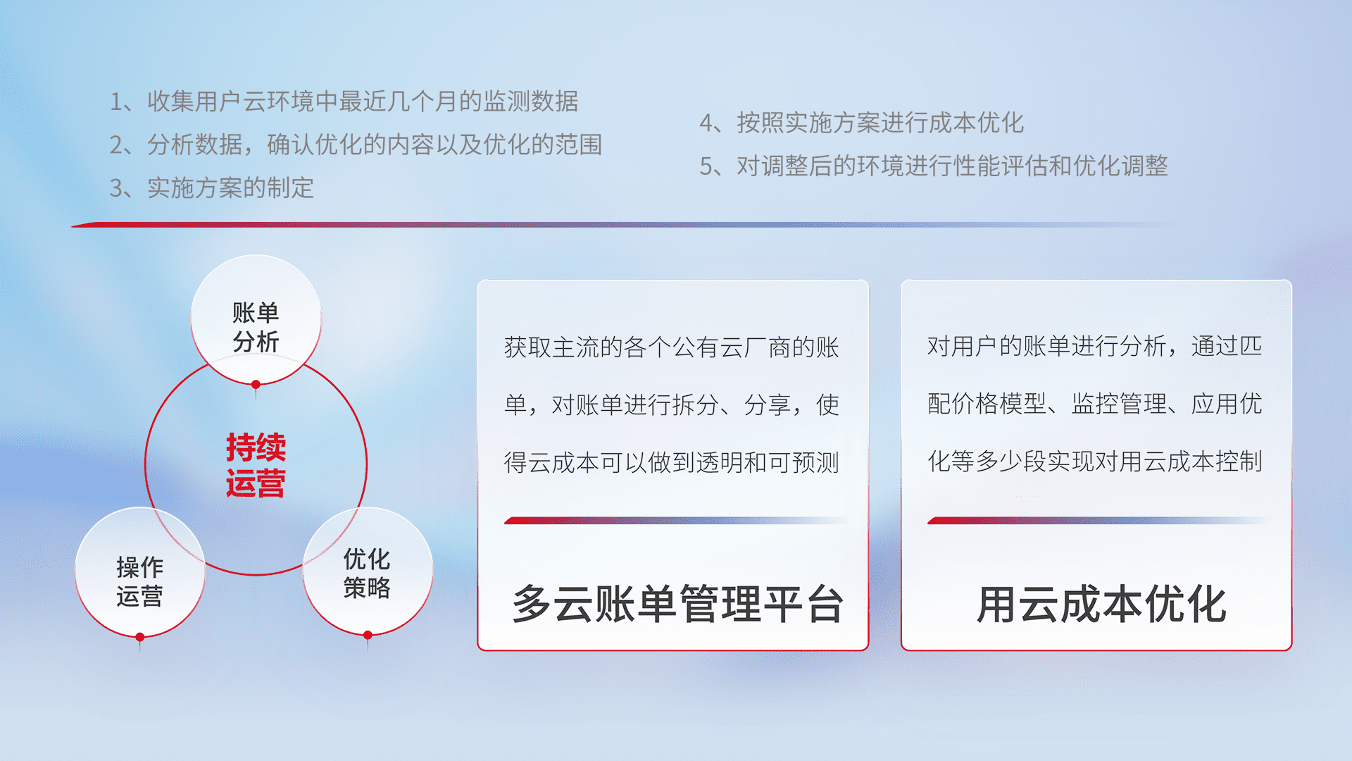 通过多云纳管,,,以统一的资源数据模型把客户的云资源进行抽象和封装,,进而实现对多云资源的统一操作,,,保障云资源管理的可靠性、、、、稳定性与可用性。。。量身定制化运维内容,,配置、、、开发运维、、、补丁管理、、、、备份、、、监控、、、、认证和访问管理、、、、审计和日常巡检等,,保障在用云过程中的可靠度,,,稳定度以及高可用率。。。