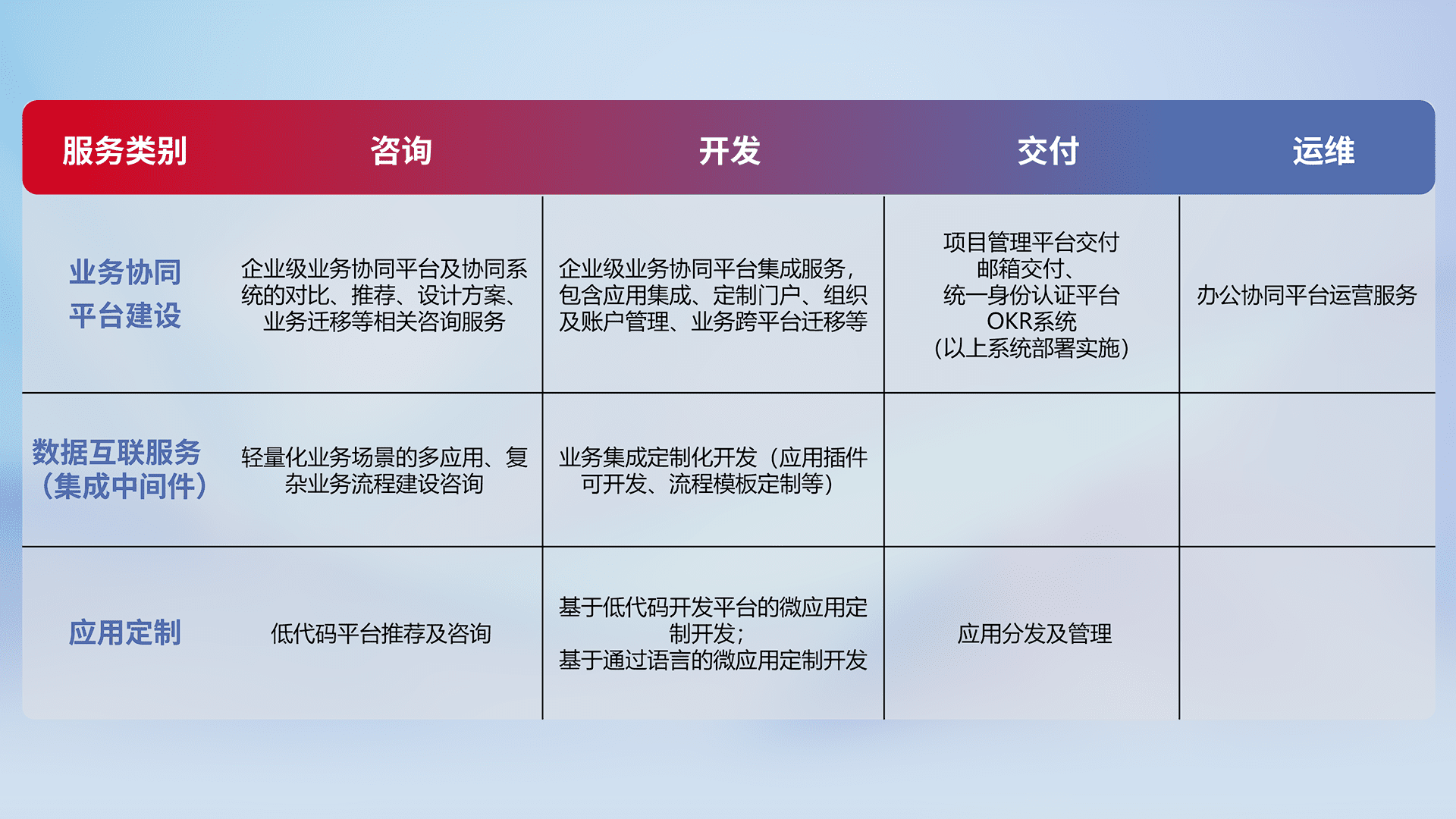 针对钉钉、、、、企微、、、、IDaas等平台级产品提供产品的规划、、方案、、、交付、、定制化开发等服务,,,实现如统一协同办公、、、智能客户服务、、、、混合会议管理、、智能数据查询、、、等业务场景,,,实现数字化转型。。。